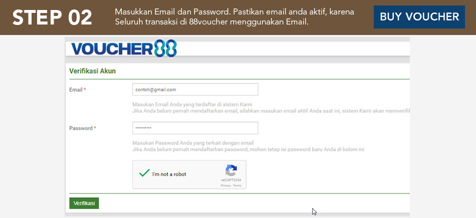 Masukkan Email dan Password. Pastikan email anda aktif, karena Seluruh transaksi di 88voucher menggunakan Email.